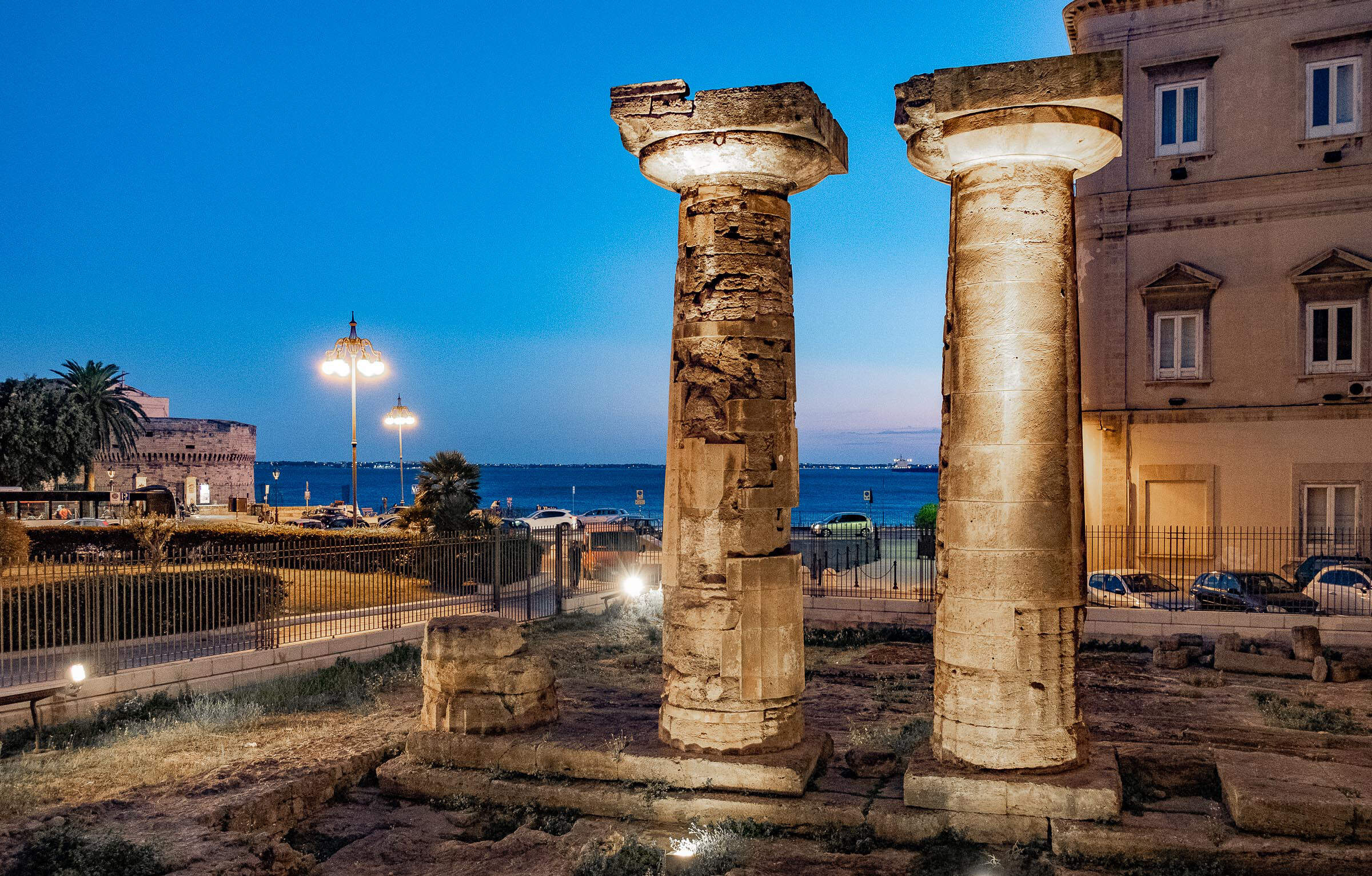 Le Colonne dell'antico Tempio dorico di Poseidone risalente al VI secolo a.C. in Piazza Castello, nella Città vecchia. Si tratta del luogo di culto più antico di tutta la Magna Grecia.